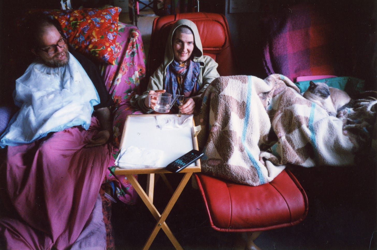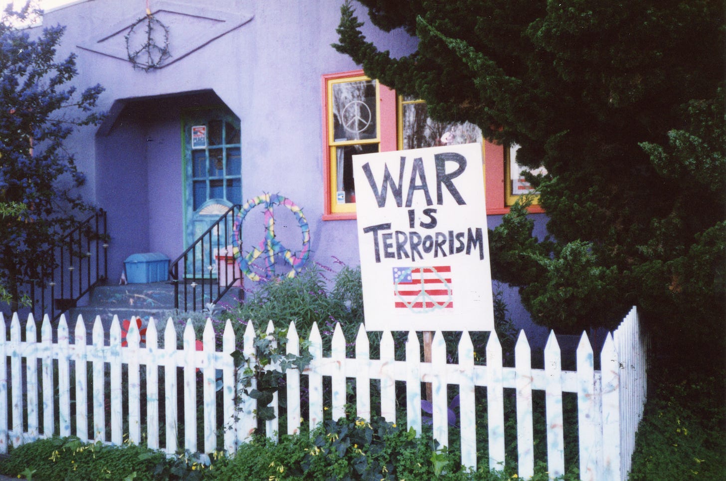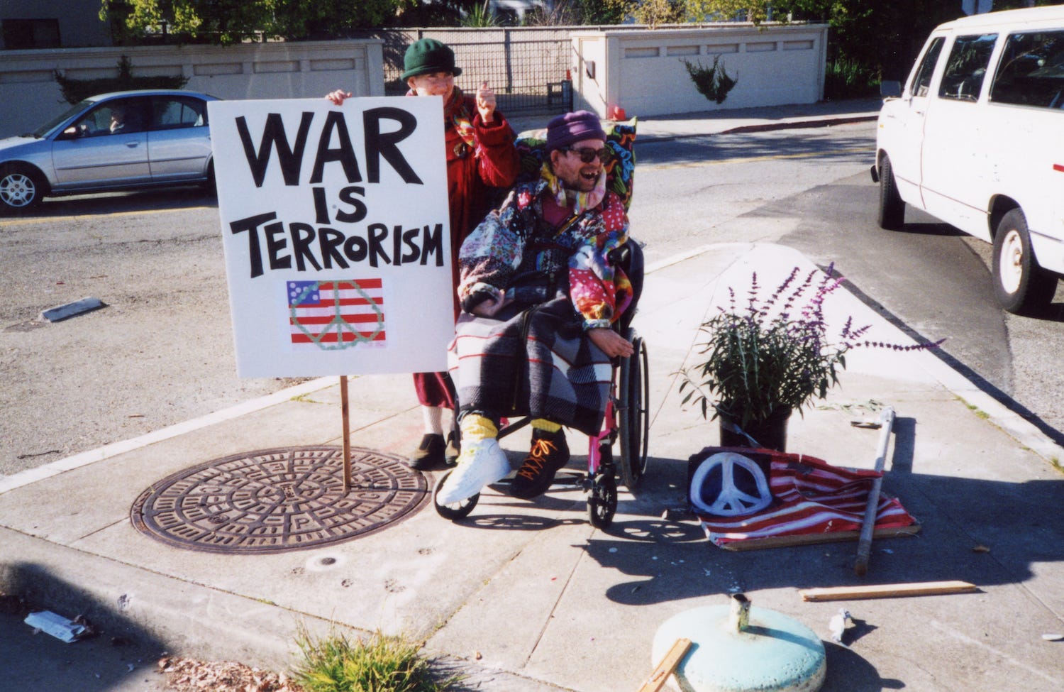 Frank and Linda protesting the Iraq war on Gilman Street in Berkeley, California, 2003.