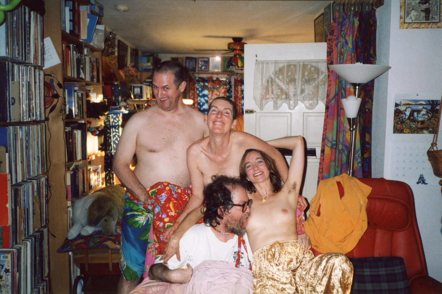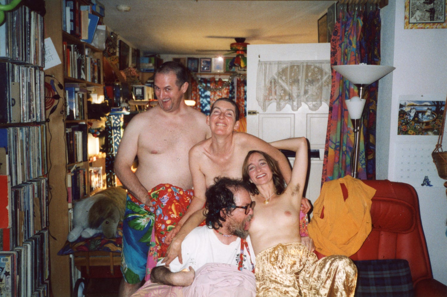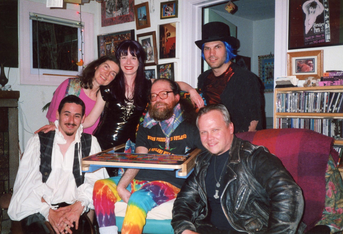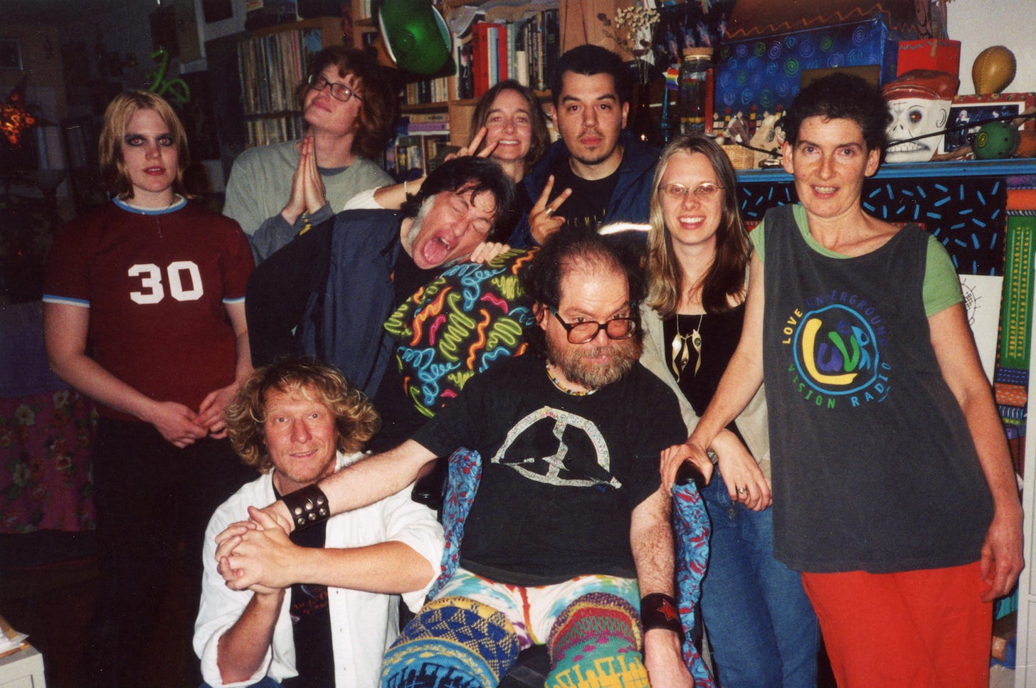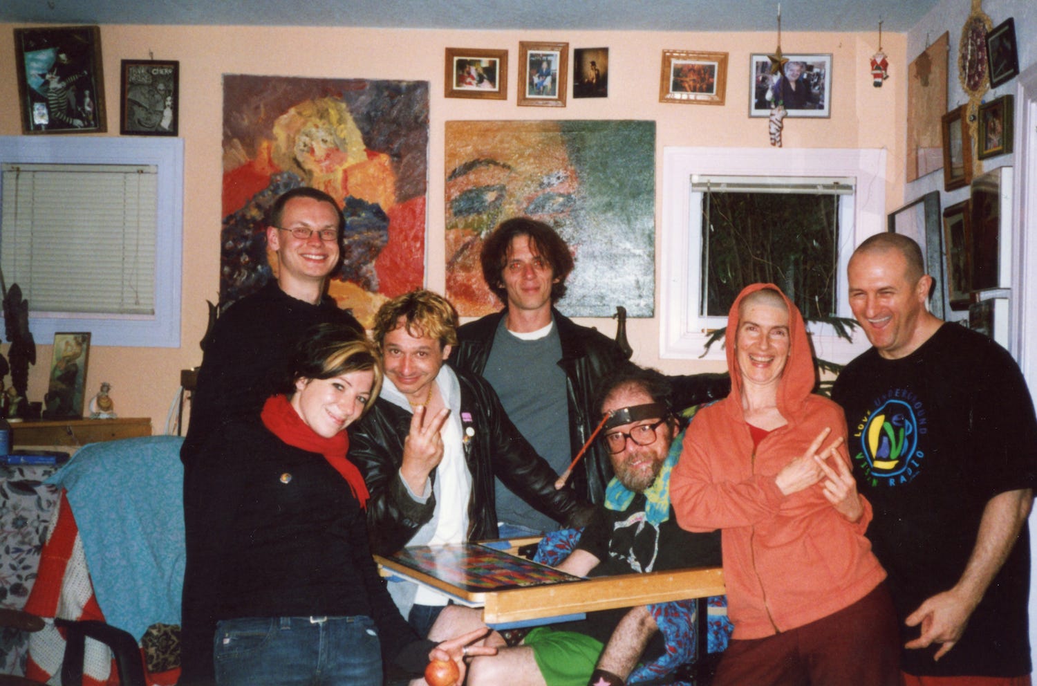 Left to right: Skye, LX Rudis (holding Frank’s hand), Stephen Jones, Michael Peppe, Kirsten Rose, Carlos, Frank Moore, Erika Shaver-Nelson, and Linda Mac at the Chaos Love Play Jam, Frank Moore’s Shaman’s Den, October 29, 2003.