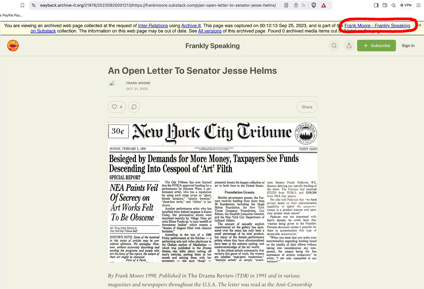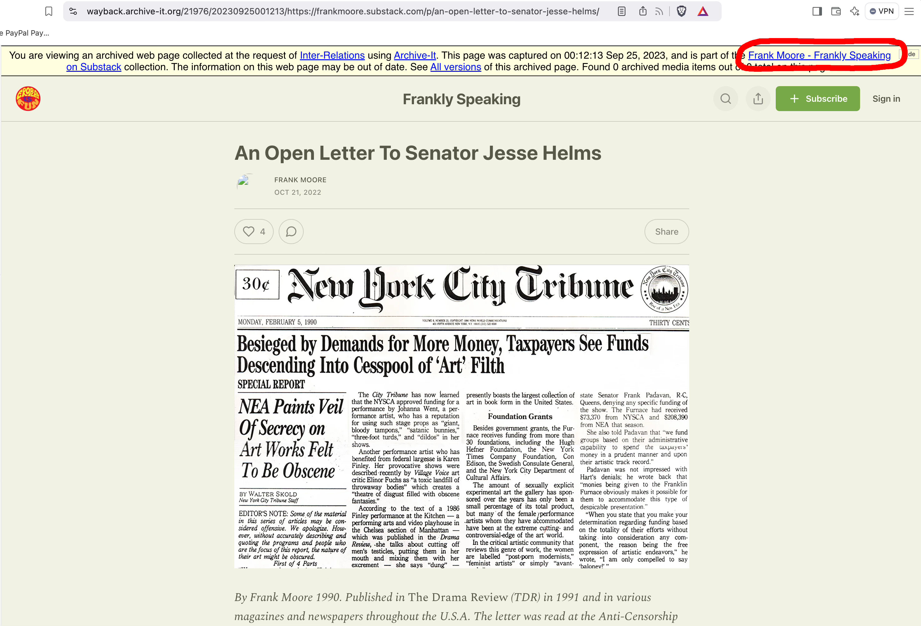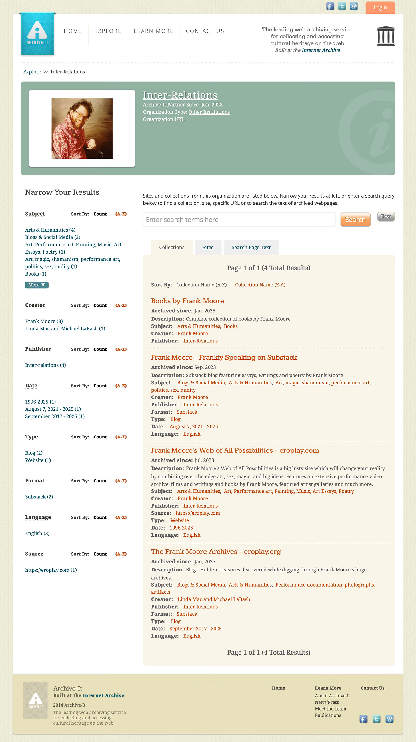We have spent the last year creating a digital archive of the Frank Moore online empire at Archive-It. At this point, there are two “Collections” in the archive: